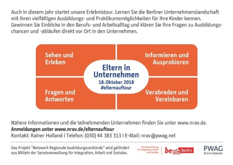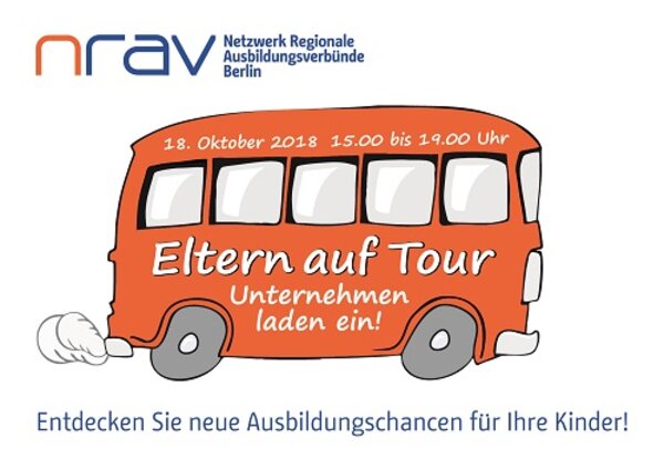 Unter dem Motto "Eltern auf Tour – Unternehmen laden ein" bietet das Netzwerk Regionale Ausbildungsverbünde (NRAV) Berlin am 18. Oktober 2018 in der Zeit von 15:00 bis 19:00 Uhr interessierten Eltern gute Gelegenheiten, direkt vor Ort ausbildende Unternehmen kennenzulernen und sich über vielfältige Möglichkeiten der dualen Ausbildung zu informieren.