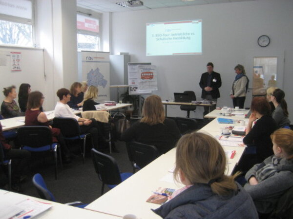 Die „Tour“ fand in den Unternehmen Euro Akademie Berlin und in den Euro-Schulen Berlin statt. Nach der Begrüßung durch die regionale Schulaufsicht Britta Tyedmers gab RAV-Netzwerkkoordinator Kilian Daske anhand einer Präsentation einen Kurzüberblick über das Thema: „Betriebliche vs. schulische Ausbildung.“ Auch der Unterschied zu geförderten Ausbildungsmöglichkeiten im Rahmen des Berliner Ausbildungsplatzprogrammes (BAPP) wurde thematisiert. ESO Azubi Oliver Haugeneder präsentierte persönlich seine bisherigen Erfahrungen in der betrieblichen Ausbildung zum Kaufmann für Büromanagement. Anschließend präsentierte Karolina Glijer vom Bewerbermanagement die vielfältigen schulischen Ausbildungsmöglichkeiten der Euro Akademie.