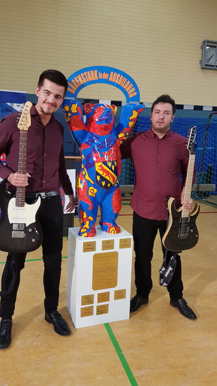 Das besondere Highlight des Abends war die Musik der Schulband der Euro Akademie, bestehend aus den Schülern Dorde Nikolic & Niklas Samland. Beide machen eine Ausbildung an der Euro Akademie. Sie verbindet die Leidenschaft zur Musik. Insofern haben die beiden für die Verleihung des Ausbildungsbuddy einen Song geschrieben, der zum Abschluss der Veranstaltung gespielt wurde. Die Textzeile „Buddybär kommt nicht von ungefähr“ macht deutlich, wieviel Engagement notwendig ist, um eine solche Auszeichnung mitnehmen zu können.