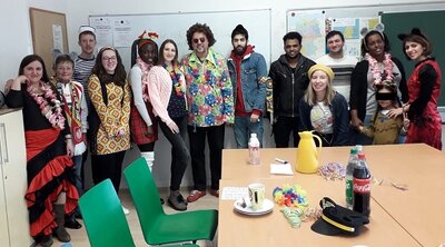 Die Teilnehmer*innen des Jugendintegrationskurses an den Euro-Schulen lernen den Karneval kennen.
