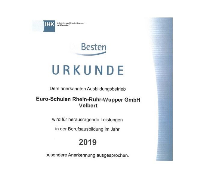 Im Jahre 2019 sind wir erneut von der Industrie- und Handelskammer (IHK) zu Düsseldorf mit einer Besten-Urkunde für unsere herausragenden Ausbildungsleistungen geehrt worden.