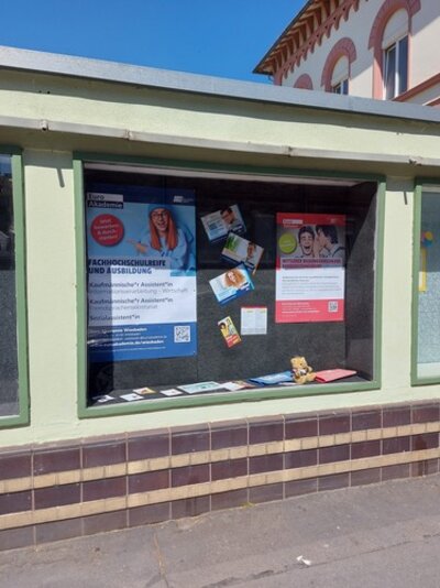 In Wiesbaden-Biebrich haben die Euro-Schulen Wiesbaden ein Schaufenster mit Infos zu den Bildungsangeboten gestaltet.